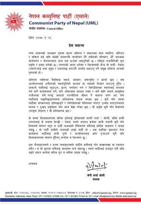 ओलीले जारी गरे वक्तव्य, विवाद समाधानको सम्भावना समाप्त भएको संकेत
