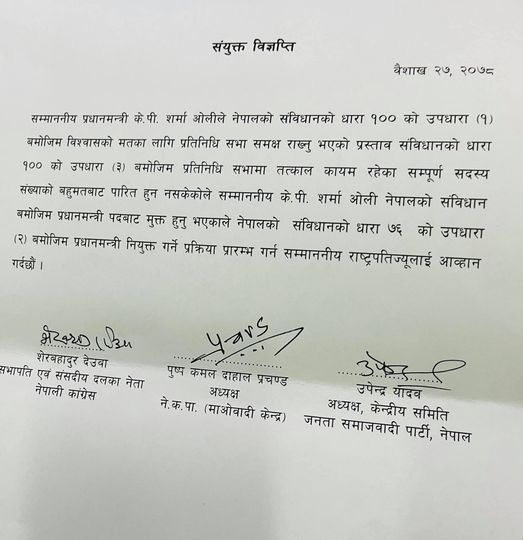 काँग्रेस सभापति शेरबहादुर देउवा, माओवादी केन्द्रका अध्यक्ष पुष्पकमल दाहाल प्रचण्ड र जनता समाजवादी पार्टीका अध्यक्ष उपेन्द्र यादवले सँयुक्त विज्ञप्ति जारी गर्दै संविधानको धारा ७६ को उपधारा २ बमोजिम सरकार गठनका लागि प्रक्रिया शुरु गर्न राष्ट्रपति समक्ष आव्हान गरेका हुन्।