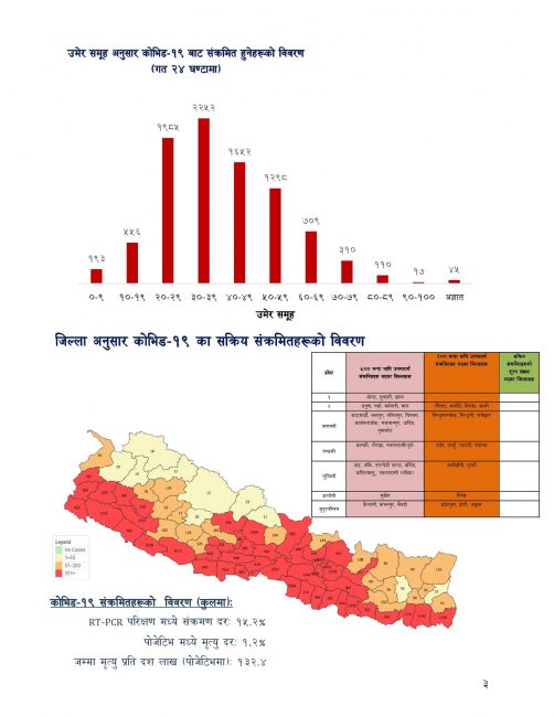२ सयभन्दा बढी सक्रिय संक्रमित रहेका जिल्लाहरुमा रौताहट, सर्लाही, सिराहा, सप्तरी, सिन्धुपाल्चोक, सिन्धुली, रामेछाप, डडेलधुरा, डोटी, अछाम, दैलेख, अर्घाखाँची, गुल्मी, तनहुँ, पर्वत, म्याग्दी र स्याङ्जा रहेका छन् ।