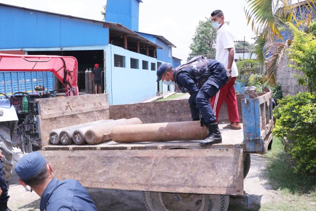 कतिपय खाली सिलिन्डरलाई भर्नका लागि डिपोमा पठाइएको प्रहरी प्रवक्ता प्रहरी वरिष्ठ उपरीक्षक बसन्तबहादुर कुँवरले जानकारी दिए। आवश्यकताभन्दा बढी अक्सिजन सिलिन्डर होल्ड गर्ने अस्पताल, व्यक्ति लगायत अन्य सङ्घसंस्था तथा स्वास्थ्य प्रयोजनबाहेक अन्य प्रयोजनमा प्रयोग गर्ने उद्देश्यले विभिन्न उद्योग, कलकारखाना, कवाडी, ग्यास वेल्डिङ, पसल तथा गोदाममा स्टक गरी राखेका अक्सिजन सिलिन्डर नियन्त्रणमा लिई स्वास्थ्य तथा जनसंख्या मन्त्रालयले निर्धारण गरेको संख्या अनुसार वितरण गरिएको प्रहरीले जनाएको छ ।