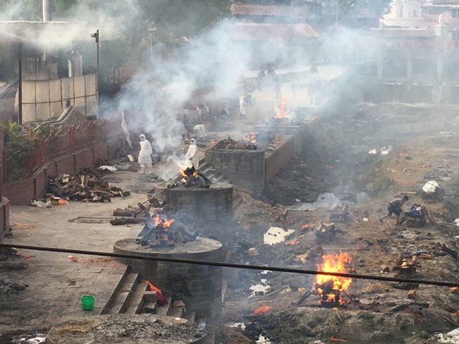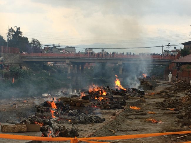 जल्दै गरेकी ती आमाको जेठो छोरा उनी भन्दै थिए, ‘उहाँ (शवहरुलाई जलाउँदै गरेका व्यक्तिलाई देखाउँदै) ले मृतकको नाम फलानो हो भन्यो भने खरानी दिनु हुन्छ। उ (औंलाले देखाउँदै) त्यो तल्लो पट्टि जल्दै गरेको मेरो आमाको चिता हो। खोलाको किनारको।’