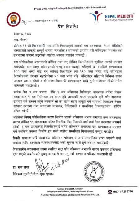 काठमाडौं। काठमाडौंस्थित देशकै ठूलो मध्येको एक निजी अस्पताल मेडिसिटी अस्पतालले अक्सिजनको अभाव भएको भन्दै नयाँ विरामी भर्ना रोकेको छ। अस्पतालले मंगलबार एक सूचना जारी गर्दै अक्सिजनको अभाव भएकाले विरामीको उपचार गर्न नसकिने बताएको हो।
