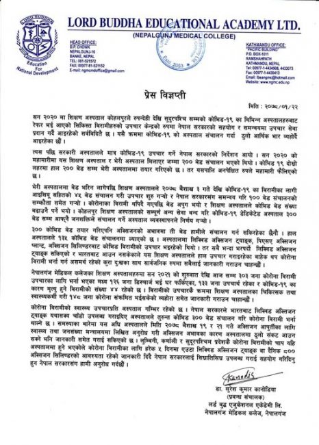 बैशाख २२ गते बाँकेको कोहलपुरस्थित कोहलपुर मेडिकल कलेजले अक्सिजन नभएको भन्दै कोरोनाका विरामी अब भर्ना गर्न नसकिने घोषणा गरेको थियो। लर्ड बुद्ध एजुकेशनल एकेडमीद्वारा सञ्चालित कोहलपुर मेडिकल कलेजलाई ३०० बेडको कोभिड १९ डेडिकेट अस्पताल बनाइए पनि अक्सिजन नभएको भन्दै विरामी भर्ना गर्न नसकिने अस्पतालले जनाएको हो।