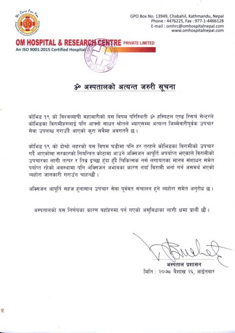 ओम अस्पताले सरकारको नियन्त्रित कोटामा आउने अक्सिजन आपूर्ति अपर्याप्त भएकोले बिरामीको उपचारका लागि तत्पर र तिव्र इच्छा हुँदाहुँदै पनि थप बिरामीको उपचार गर्न असमर्थ रहेको बताएको छ।