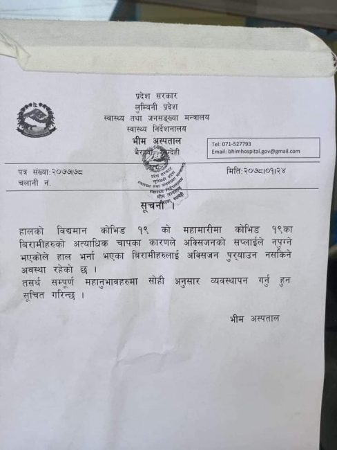 शुक्रबार रुपन्देहीको भीम अस्पतालले पनि एक सूचना जारी गरेर कोभिड १९ का बिरामीको अत्याधिक चाप भएकोले अक्सिजन नपुग्ने भन्दै बिरामी भर्ना गर्न सक्ने अवस्था नरहेको जानकारी दियो।