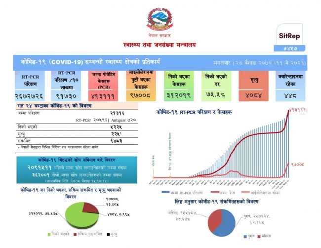 थप ९ हजार ४८३ जनामा कोरोना भाइरस संक्रमण पुष्टि भएसँगै नेपालमा कोरोना संक्रमितको कुल संख्या ४ लाख १३ हजार १११ पुगेको छ । स्वास्थ्य तथा जनसंख्या मन्त्रालयका अनुसार नेपालमा सक्रिय संक्रमितको संख्या ९७ हजार ८ रहेको छ । पछिल्लो २४ घण्टामा ५ हजार २२५ जना निको भएका छन् ।