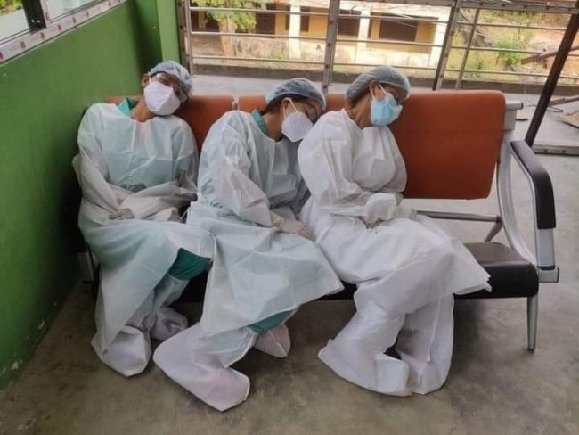 पीपीई भित्र अत्याधिक गर्मीले पाकिरहेको ज्यान। नर्सिङ जीवन भोग्नेका लागि अहिले साँच्चिकै कहालीलाग्दो अबस्था छ। पीपीई भित्रका नर्सहरुको भोक प्यास नभनी सेवामा समर्पित हुँदा तस्वीरहरुले आज विश्वलाई नै भावुक र चिन्तित गराएका छन्।