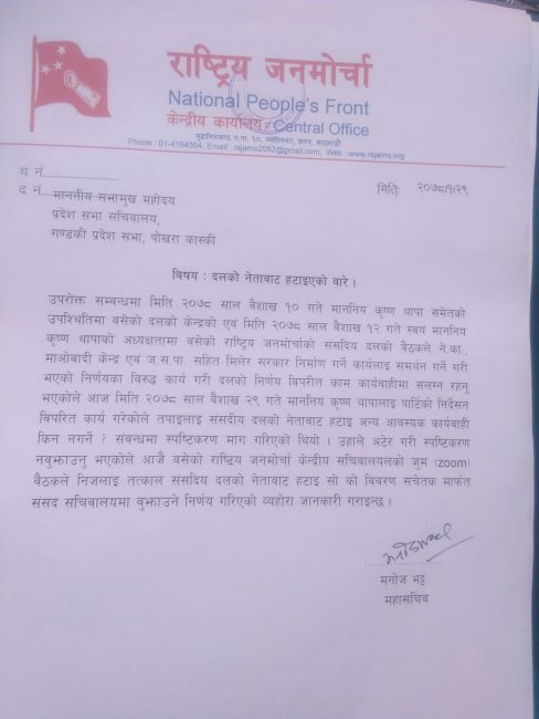 सचेतक पियारी थापाले प्रदेशसभा सदस्य थापालाई संसदीय दलको नेताबाट हटाएको पार्टीको निर्णय सभामुख नेत्रनाथ अधिकारीलाई जानकारी गराएकी हुन्।