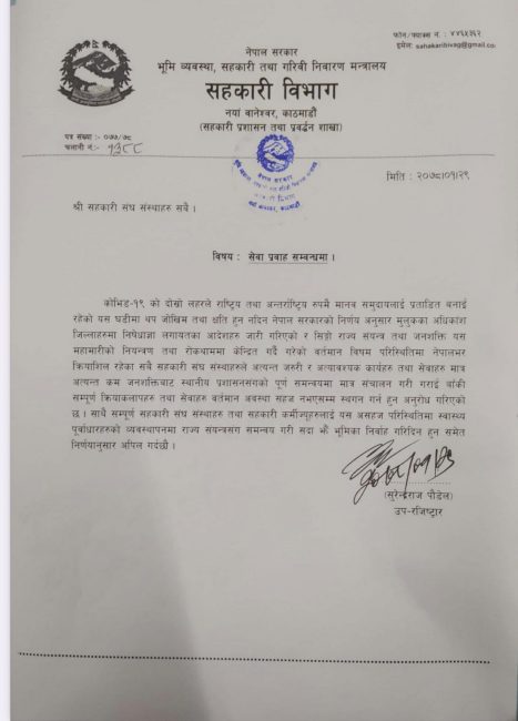 विभागले सबै सहकारी संघ संस्थाहरुलाई अत्यन्त जरुरी तथा अत्याआवश्यक कार्यहरु तथा सेवा बाहेकका सबै सेवा बन्द गर्न अनुरोध समेत गरेको छ।