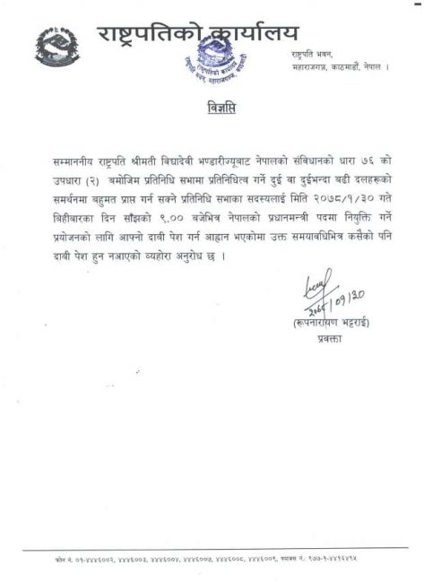 राष्ट्रपतिले दिएको समयसीमामा सरकार बनाउने दावी पेश भएन