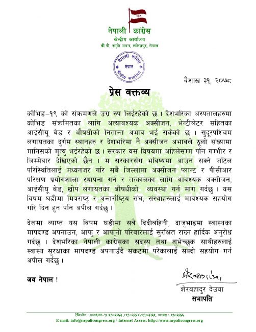 सभापति देउवाले भनेका छन्, ‘देशमा व्याप्त यस विषम घडीमा सबै दिदीबहिनी, दाजुभाइमा स्वास्थका मापदण्ड अपनाउन, आफु र आफ्नो परिवारलाई सुरक्षित राख्न हार्दिक अनुरोध गर्दछु। देशभरिका नेपाली कांग्रेसका सदस्य तथा शुभेच्छुक साथीहरुलाई स्वास्थ सुरक्षाका मापदण्ड अपनाउँदै संकटमा परेकालाई सक्दो सहयोग गर्न अपील गर्दछु।’