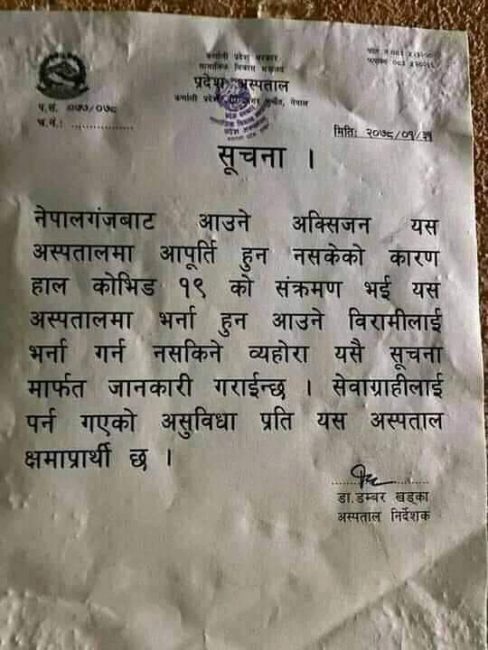काठमाडौं । कोरोना महामारीले त्राहीत्राही भइरहेका बेला कर्णाली प्रदेश अस्पताल सुर्खेतले कोरोनाका नयाँ बिरामीको भर्ना नलिने बताएको छ।शनिबार एक सूचना जारी गर्दै अस्पतालले भर्ना नलिने जानकारी दिएको छ।