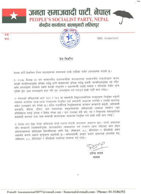 यस्तै कोरोना नियन्त्रणमा सम्पूर्ण शक्ति लगाउन पनि जसपाले माग गरेको छ। जसपाको महन्थ ठाकुर समूह प्रधानमन्त्री ओलीसँग निकट छ भने उपेन्द्र समूह विरोधमा छ।