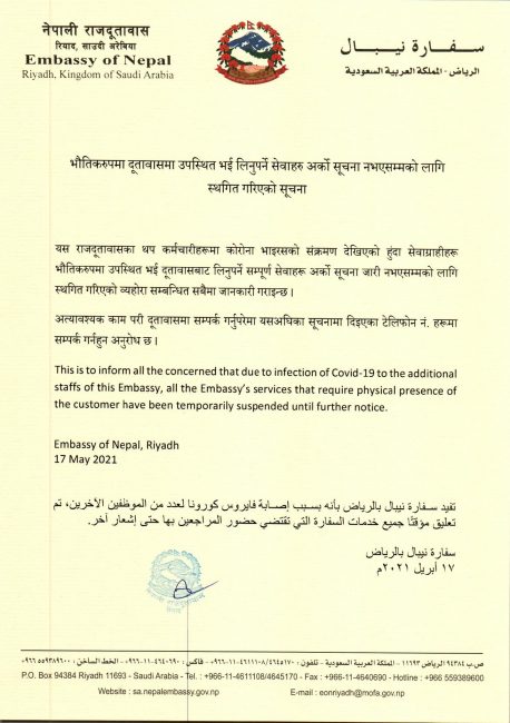 साउदीस्थित नेपाली दूतावासका कर्मचारीलाई कोरोना पुष्टि, भौतिक सेवा बन्द