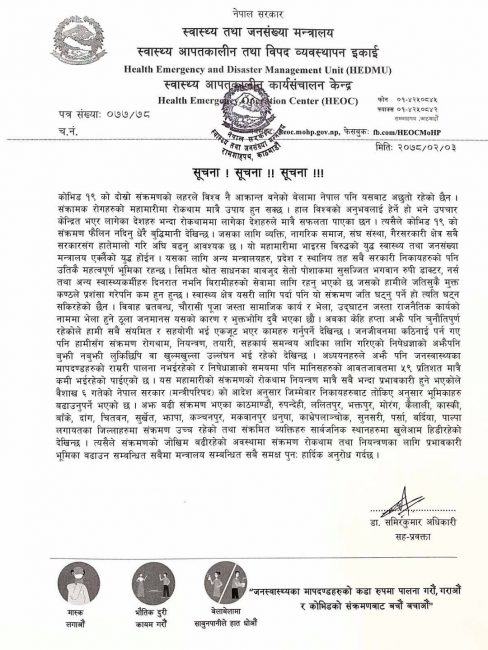 जनजीवनमा कठिनाई पर्न गए पनि हामीसंग संक्रमण रोकथाम, नियन्त्रण, तयारी, सहकार्य समन्वय आदिका लागि गरिएको निषेधाज्ञाको अझै पनि बुझी नबुझी लुकीछिपि वा खुल्मखुल्ला उल्लङ्घन भइरहेको देखिन्छ उनले जारी गरेको सूचनामा भनिएको छ । यस्तै कोरोना भाइरस विरुद्धको लडाई मन्त्रालयको एक्लैको नभई सवैको भएको भन्दै यसको रोकथाम, उपचार र नियन्त्रणमा सवैको सहयोग हुनुपर्ने बताए ।