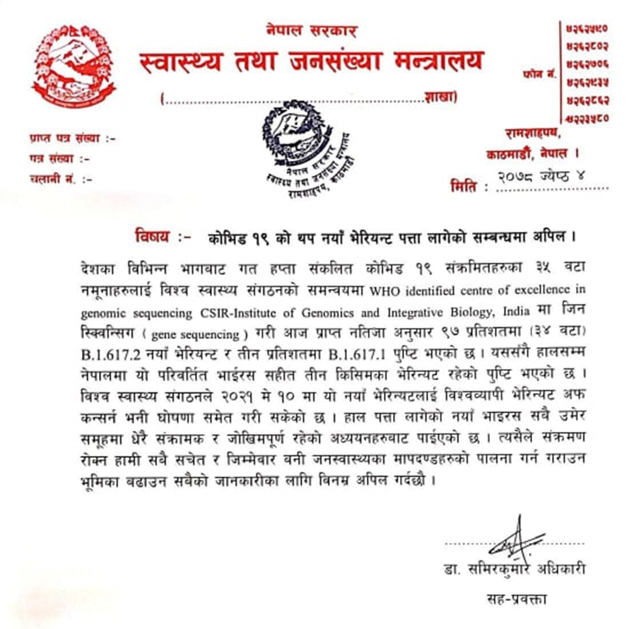 नेपालमा फैलिएको कोरोना भारतीय भेरियन्ट भएको पुष्टि