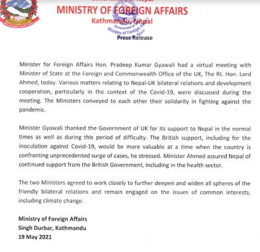 वार्ताका क्रममा परराष्ट्रमन्त्री ज्ञवालीले बेलायतले नेपालमा कोरोनाविरुद्धको लडाइँमा गरेको सहयोगका लागि धन्यावाद दिएका छन्। मन्त्रलयका अनुसार मन्त्री ज्ञवालीले आगामी दिन पनि बेलायतको सहयोग जारी रहने विश्वास व्यक्त गरेका छन्। उनले नेपालको वर्तमान स्वास्थ्य अवस्थाबारे कुरा गर्दै बेलायती सहयोगको अपेक्षा गरेका छन्।