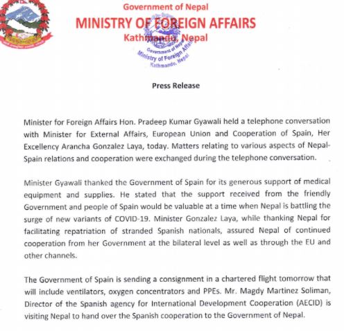 यस्तै मन्त्री ज्ञवालीले स्पेनकी विदेश मामिला मन्त्री अरन्चा गोन्जालेज लियासँग टेलिफोन वार्ता गरेका छन्। वार्ताका क्रममा नेपालको कोरोनाविरुद्धको लडाइँमा स्पेनको सहयोगका लागि धन्यावाद दिएका थिए। सो क्रममा विहीबार स्पेनबाट स्वास्थ्य सामाग्री नेपाल आउन लागेको विषयमा पनि कुराकानी भएको परराष्ट्र मन्त्रालयले जनाएको छ। स्पेनमा रहेका नेपालीहरुको सहयोग र समन्वयमा विहीबार स्पेनबाट स्वास्थ्य सामाग्री नेपाल आउँदैछ।