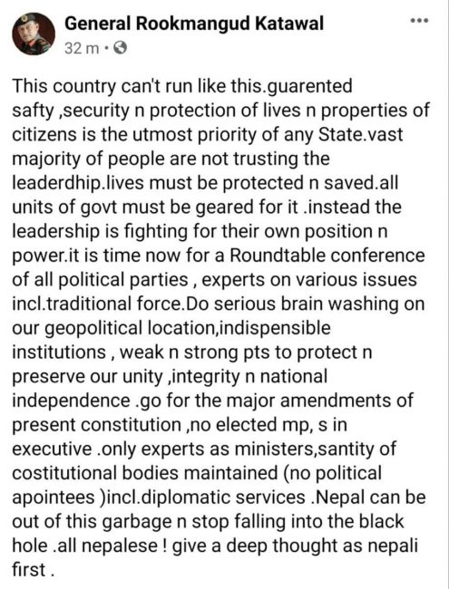 बिहीबार विहान आफ्नो सामाजिक सञ्जालमार्फत एक सन्देश जारी गर्दै पूर्व सेनापति कटवालले जनताको सुरक्षा, जीउधानको रक्षा सबैभन्दा बढी राज्यको प्राथमिकता हुनुपर्नेमा त्यसो नभएकोले मुलुक यसरी चल्न नसक्ने भन्दै आक्रोश पोखेका छन्।