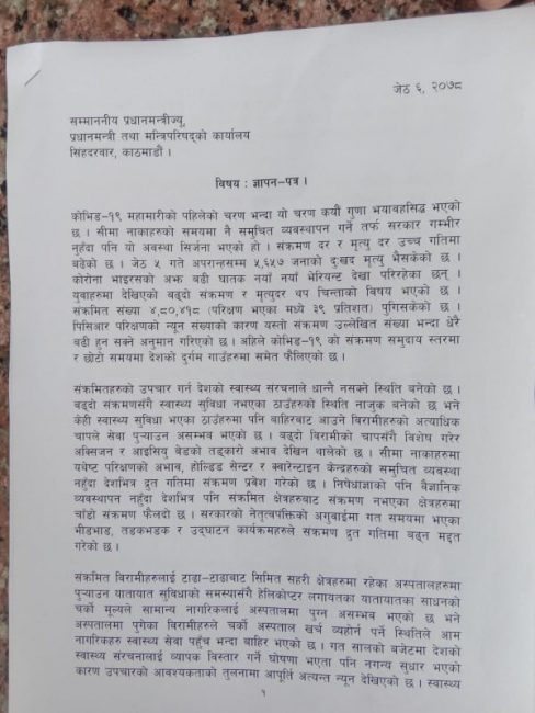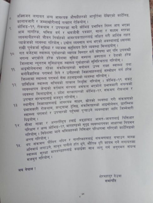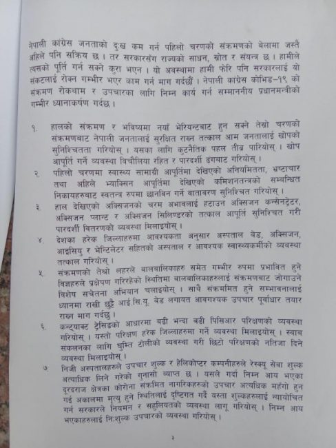 नेपाली कांग्रेसले काेराेना नियन्त्रणका लागि सरकारलाई बुझायाे ज्ञापन पत्र (पत्रसहित)