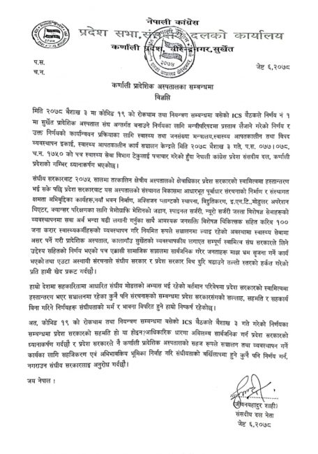 सुर्खेत। कर्णाली प्रदेश अस्पताललाई संघीय सरकार मातहतमा लिने गरेको निर्णय प्रति नेपाली काँग्रेस कर्णाली प्रदेश सभा संसदीय दलले आपत्ति जनाएको छ।