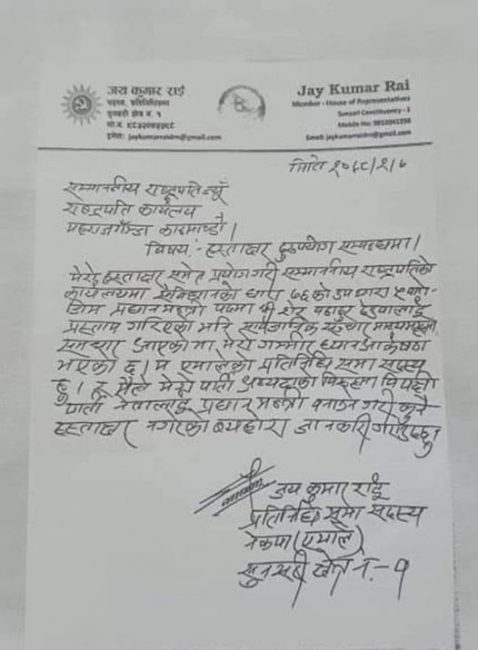एमालेका राईले राष्ट्रपतिलाई निवेदन लेखेर भनेः देउवालाई मेरो समर्थन छैन