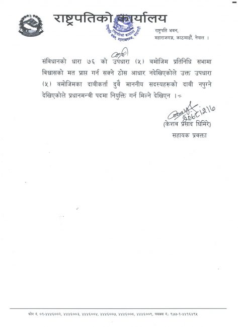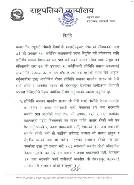 शुक्रबार राति साढे ११ बजे राष्ट्रपतिले सरकार गठनबारे यो निर्णय लिएकी हुन्। राष्ट्रपतिले दुबै दावीकर्तामा दोहोरो सांसदले समर्थन जनाएको तथा एमाले र जसपाले सांसदहरुको हस्ताक्षरलाई मान्यता नदिनु भनेकाले दावी नपुग्ने निर्णय गरेकी हुन्।