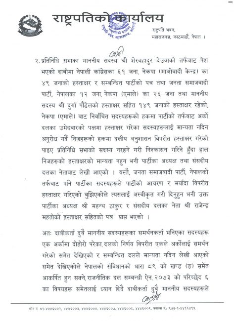मध्यराति राष्ट्रपतिको निर्णयः प्रधानमन्त्रीका लागि गरिएका दुबै दावी खारेज