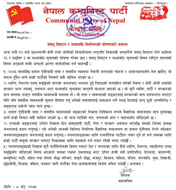 काठमाडौं। प्रधानमन्त्रीको सिफारिसमा प्रतिनिधिसभा विघटन भएर मध्यावधि निर्वाचनको घोषणा भएपछि नेत्रविक्रम चन्द विप्लवको पार्टी नेकपाले जनमतसंग्रहको माग गरेको छ । राज्यको संकटलाई उचित निकास दिन संसदवादी पार्टी, नेता र सरकार असफल भएपछि यसको जिम्मा प्रत्यक्ष जनतालाई दिनुपर्ने विप्लवले एक विज्ञप्ति जारी गर्दै बताएका छन् ।