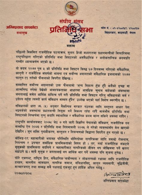 पछिल्लो विकसित राजनीतिक घटनाक्रम, मूलतः हिजो मध्यरातमा प्रधानमन्त्रीको सिफारिसमा राष्ट्रपतिद्वारा गरिएको प्रतिनिधि सभा विघटनको असंवैधानिक र अलोकतान्त्रिक कदमप्रति गम्भीर ध्यानाकर्षण भएको छ ।