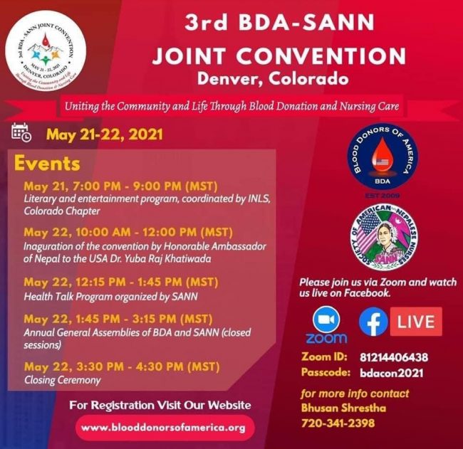 उनले नेपाललाई तत्काल चाहिने ५० लाख खोप उपलब्ध गराउन अमेरिका लगायत विश्व समुदायसँग नेपालले आग्रह गरेको पनि बताए। नेपालीहरुको नेतृत्वमा रहेका दुई अमेरिकी संस्थाहरु ब्लड डोनर्स अफ अमेरिका(बीडीए) र सोसाइटी अफ अमेरिकन नेप्लिज नर्सेस (सान) को तेस्रो संयुक्त सम्मेलनको भर्चुअल माध्यमबाट आज उद्घाटन गर्दै उनले नेपालको गम्भीर स्वास्थ्य संकटको अवस्थामा विभिन्न स्वास्थ्य सामग्रीहरु सहयोगका लागि अमेरिकी सरकारसंग आग्रह गरिएको पनि उनले बताएका छन्।