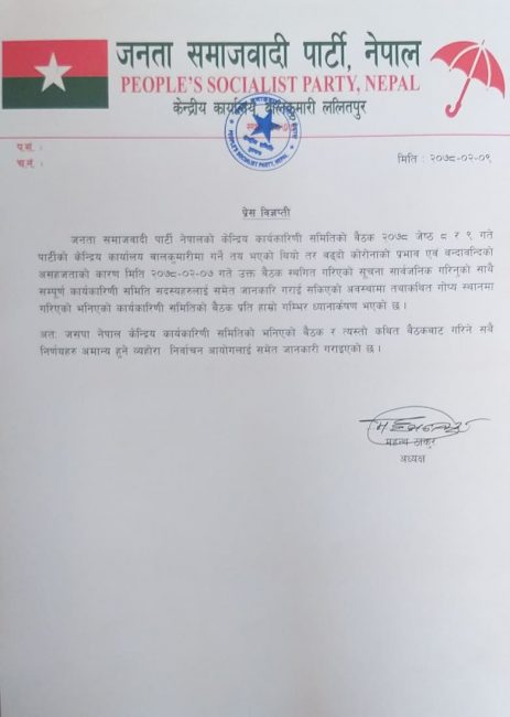 यसअघि दुबै अध्यक्ष ठाकुर र यादवले सँयुक्त वक्तवय जारी गर्दै ८ र ९ गतेका लागि कार्यकारिणी बैठक बोलाइएको बताएका थिए। तर, त्यहिबीचमा सरकार गठन प्रक्रियामा ठाकुरले प्रधानमन्त्री केपी शर्मा ओलीके समर्थन गरे भने यादवले काँग्रेस सभापति शेरबहादुर देउवाको।