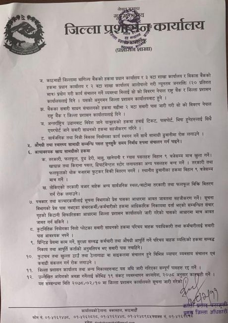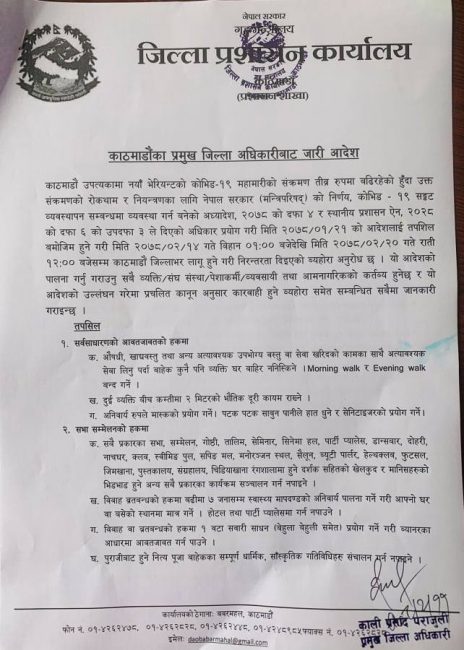 मंगलबार कोभिड १९ संकट व्यवस्थापन अध्यादेश जारी भएपछि त्यसमा भएका प्रावधान कार्यान्वयन गर्न आज काठमाडौं उपत्यकाका तीनै जिल्लाका प्रमुख जिल्ला अधिकारीहरुको बैठकले निषेधाज्ञा जेठ २० गते मध्यरातसम्म कायम रहने निर्णय गरेको हो।