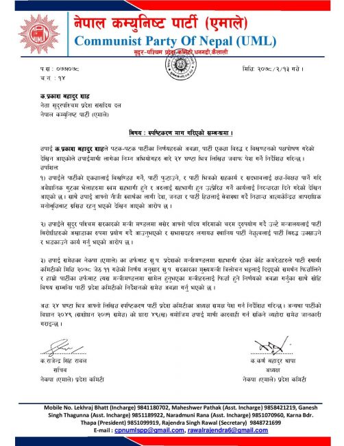 एमाले प्रदेश कमिटीका अध्यक्ष अध्यक्ष कर्णबहादुर थापा र सचिव राजेन्द्रसिंह रावलले आन्तरिक मामिला तथा कानून मन्त्री प्रकाश शाह, सामाजिक विकास मन्त्री कृष्ण सुवेदी र उद्योग वन तथा वातावरण मन्त्री माया भट्टलाई २४ घण्टे स्पष्टीकरण सोधेका हुन्।