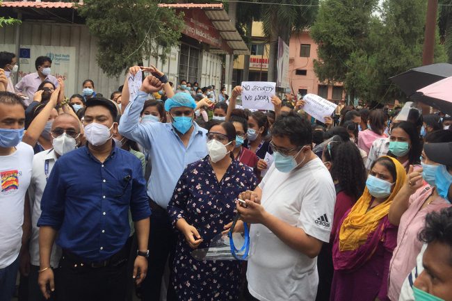 काठमाडौं। नेपालगञ्जस्थित भेरी अस्पतालमा कार्यरत डाक्टर तथा नर्सहरूले सुरक्षाको ग्यारेन्टी र दुव्र्यवहार गर्नेलाई कारवाही हुनुपर्ने माग राखेर आन्दोलन गरिरहेका छन्। गएराति ८ बजे दाङका एक विरामीको अस्पतालमा मृत्यु भएपछि मृतकका आफन्तले डाक्टर र नर्सहरुमाथि हातपात भएको नर्सिङ अधिकृत इश्वरी केसीले जानकारी दिइन्।