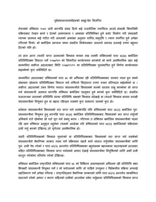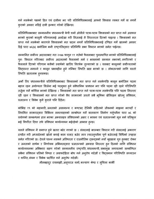 ‘कोभिड–१९ को महामारी, जनताको असामान्य र कष्टप्रद दैनिकी सहितको जीवनको माझमा भरपर्दो र नियमित सरकारद्वारा बिभिन्न समस्याहरूको सम्बोधन गर्ने वातावरण निर्माण गर्नुपर्नेमा धारा ७६ को प्रयोगको सम्बन्धमा हाल भएका अभ्यासहरू संविधानको अक्षर र भावना एवं प्रजातन्त्रको मूल मर्म प्रतिकूल भई विपरित दिशातर्फ संविधान कार्यान्वयन भईरहेको आभास हुन्छ,’ पूर्वप्रधानन्यायाधीशहरूले भनेका छन्, ‘यसले संविधान नै समाप्त हुने खतरा बढेर गएको छ।’