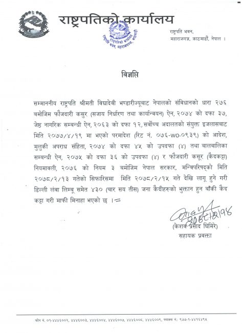 राष्ट्रपतिद्वारा ४ सय ३० जना कैदीलाई माफी मिनाहा