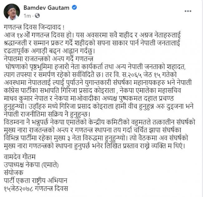 गौतमले भनेका छन्, ‘बिडम्बना नै भन्नुपर्छ नेकपा एमालेको केन्द्रीय कमिटीको बहुमतले तत्कालीन संघर्षको मुख्य नारा राजतन्त्रको अन्त्य र गणतन्त्र स्थापना तय गर्दा चर्चित झापा संघर्षका विभिन्न पार्टीमा रहेका मुख्य ३ नेता विरुद्धमा हुनुहुन्थ्यो।त्यो बैठकमा अव संघर्षको मुख्य नारा गणतन्त्रको स्थापना हुनुपर्छ भनेर लिखित प्रस्ताव राख्ने व्यक्ति म थिएँ ।’।