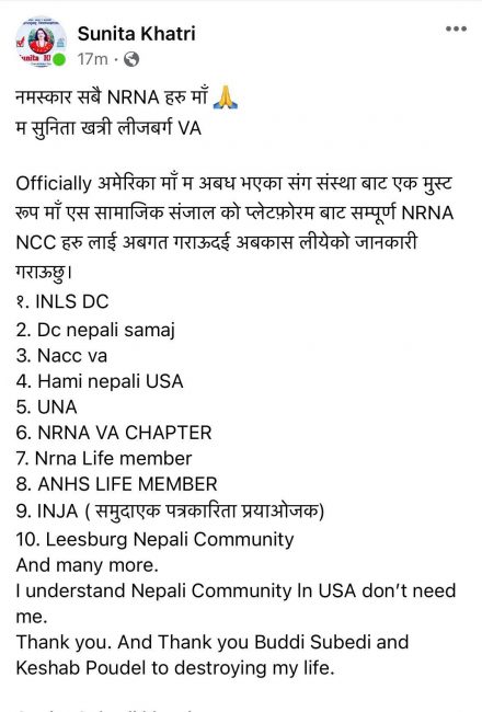 गैरआवासीय नेपाली संघ, राष्टिय समन्वय परिषद्को महिला संयोजक पदमा उम्मेद्वार बनेकी भर्जिनिया निवासी सुनिता खत्रीले नव निर्वाचित अध्यक्ष बुद्धि सुवेदी र अघिल्लो कार्यकालका अध्यक्ष केशव पौडेलको नाम नै लेखेर आफूलाई बरबाद पारेको आरोप लगाएकी छिन्।