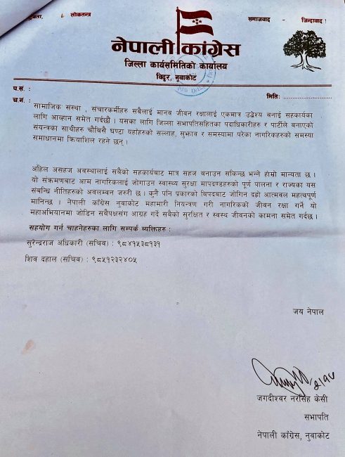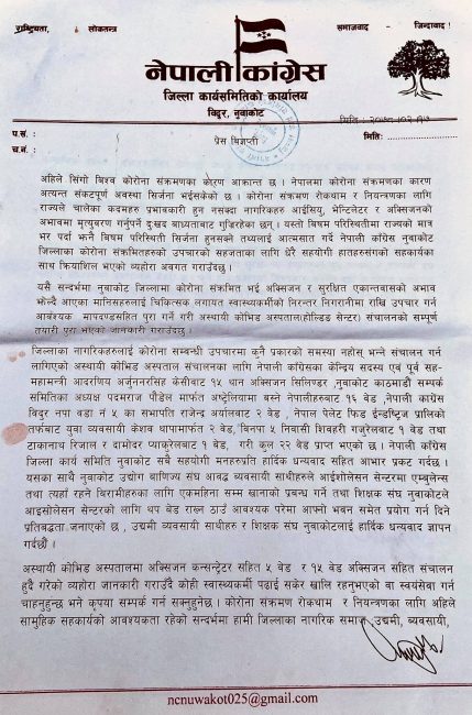 काठमाडौं। नेपाली काँग्रेस नुवाकोटले कोरोना संक्रमितको उपचारका लागि २० बेडको आइसोलेशन सेन्टर बनाएको छ। नेपाली काँग्रेस नुवाकोटका सभापति जगदीश्वरनरसिंह केसीले सोमबार एक विज्ञप्ति जारी गर्दै अक्सिजनसहितको आइसोलेशन सेन्टर तयार भएको जानकारी दिएका छन्।