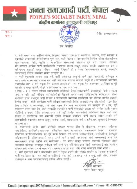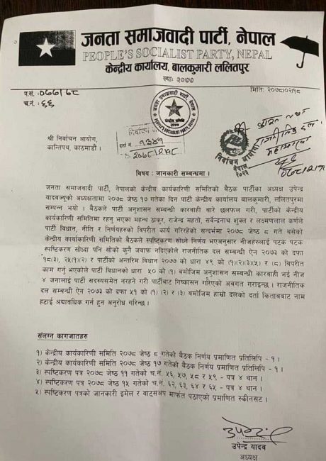 जसपाले निष्कासनबारे निर्वाचन आयोगलाई पनि जानकारी गराएको छ । आयोगमा दर्ता गरिएको पत्रमा जेठ १७ गते पार्टी कार्यालय बालकुमारीमा बसेको कार्यकारिणीको बैठकले निष्कासनको निर्णय गरेको उल्लेख गरिएको छ ।