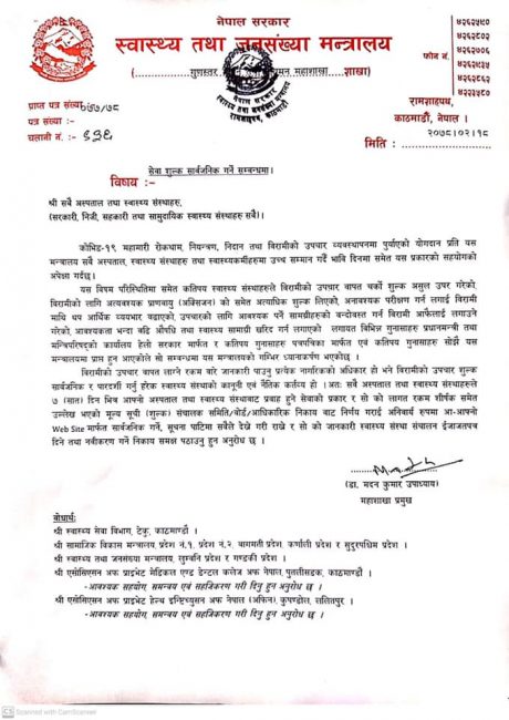 कोरोना महामारीको समयमा बिरामीको उपचारवापत चर्को शुल्क लिएको गुनासो आएको भन्दै मन्त्रालयले सूचना जारी गर्दै सरकारी, निजी तथा सामुदायिक सबै अस्पताललाई बिरामीको उपचारवापत लाग्ने रकम ७ दिनभित्र सार्वजनिक गर्न निर्देशन दिएको हो।