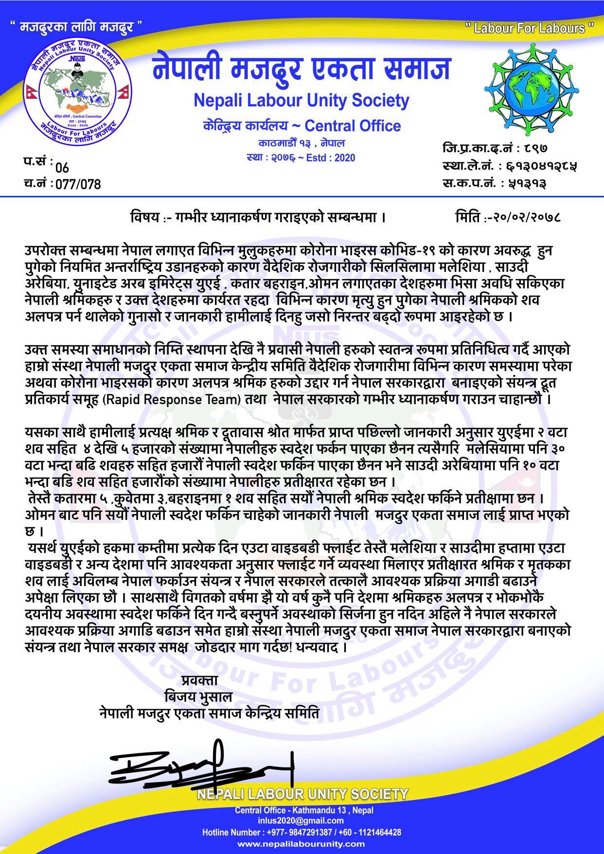 नेपाललगायत विभिन्न मुलुकहरूमा कोरोना भाइरस कोभिड–१९ को कारण अवरुद्ध हुन पुगेको नियमित अन्तर्राष्ट्रिय उडानहरूको कारण वैदेशिक रोजगारीको सिलसिलामा मलेसिया, साउदी अरेबिया, युएई, कतार, बहराइन, ओमनलगायतका देशहरूमा भिसा अवधि सकिएका नेपाली श्रमिकहरू र उक्त देशहरूमा कार्यरत रहँदा विभिन्न कारण मृत्यु हुन पुगेका नेपाली श्रमिकको शव अलपत्र पर्न थालेको गुनासो आएपछि सरकारको ध्यानाकर्षण गराइएको हो ।
