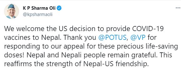 I join my fellow Americans, & all friends of Nepal, in celebrating the @WhiteHouse announcement that Nepal will be among the countries to receive direct vaccine donations from the United States. More details are coming soon! Together we will #beatthevirus.https://t.co/0gM5inom5x pic.twitter.com/0aLf8p00iJ