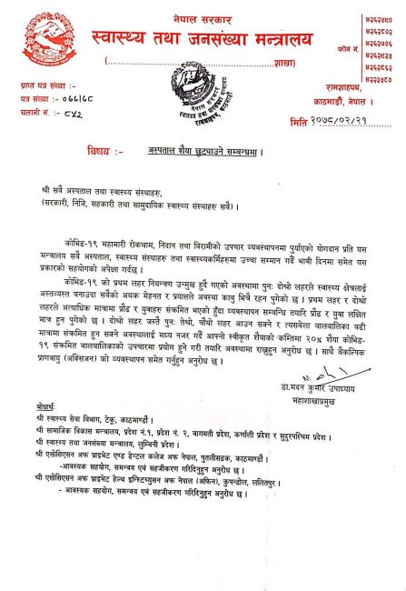 मन्त्रालयले सरकारी, निजी, सामूदायिक सबै अस्पतालहरुलाई यस्तो निर्देशन दिएको हो। देशमा हाल कोरोनाको दोस्रो लहरले हाहाकार मच्चाइरहेको छ। र विज्ञहरुले तेस्रो लहर आउन सक्ने चेतावनी दिइरहेका छन्।