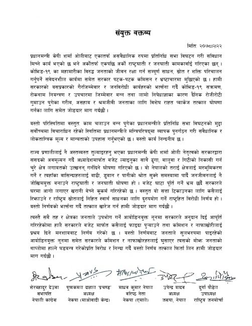 शनिबार सँयुक्त विज्ञप्ति जारी गर्दै उनीहरुले भनेका छन्, ‘प्रधानमन्त्री केपी शर्मा ओलीबाट एकातर्फ असंवैधानिक रुपमा प्रतिनिधि सभा विघटन गरि संविधान मिच्ने कार्य भएको छ भने अर्कोतर्फ एकपछि अर्को राष्ट्रघाति र जनघाति कामकारवाई गरिएका छन्।’