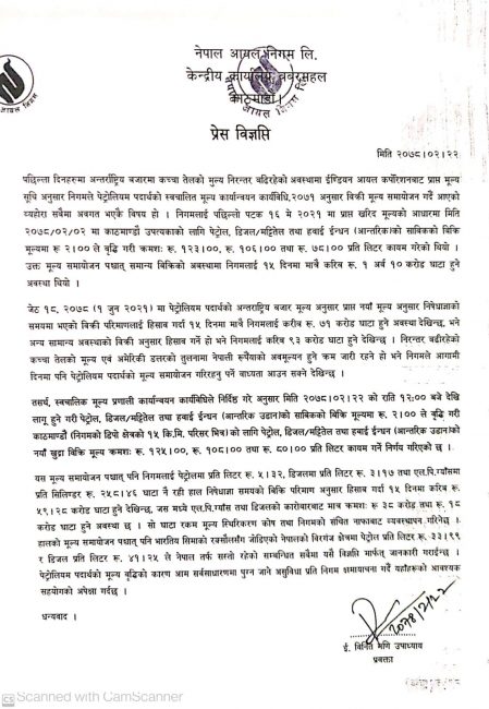 यसअघी निषेधाज्ञाकै बीचमा गत जेठ दुई गते पनि निगमले इन्धनको मूल्य बृद्धि गरेको थियो । मूल्यवृद्धिपछि काठमाडौंमा पेट्रोलको मूल्य प्रतिलिटर १२५, डिजेल तथा मट्टितेलको १०८ र हवाई इन्धन आन्तरिकतर्फको मूल्य प्रतिलिटरमा ८० रुपैयाँ पुगेको छ ।