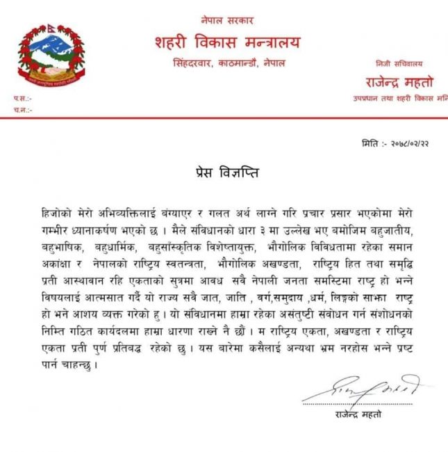 शनिबार राति एक विज्ञप्ति जारी गर्दै महतोले प्रस्टोक्ति दिएका हुन्। उनले आफ्नो भनाइलाई बंग्याएर प्रस्तुत गरिएकोसमेत बताएका छन्। उनले देश बहु जातीय, बहु भाषिक, बहु धार्मिक रहेको र सोहीअनुसार अभिव्यक्ति दिएको बताएका छन्। उनले संविधानमा रहेका असन्तुष्टिबारे संविधान संशोधनका लागि बनेको कार्यदलमै आफ्नो धारणा राख्नेसमेत बताएका छन्।