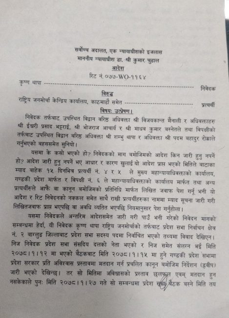 जनमोर्चा प्रदेशसभा सदस्यको पदबहाली गर्न सर्वोच्चको अन्तरिम आदेश