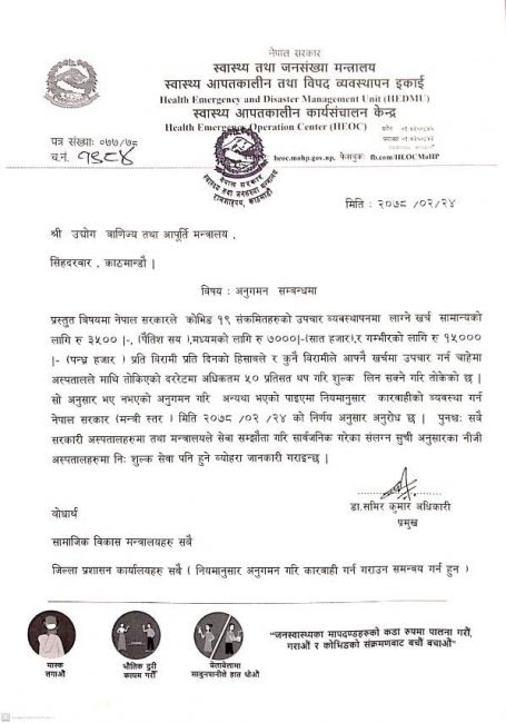 कोरोना संक्रमितको उपचारमा धेरै शुल्क लिनेलाई कारबाही गर्न परिपत्र